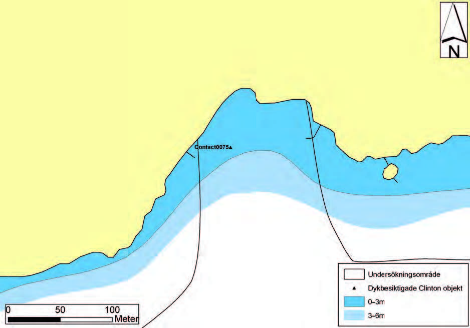 Karta som visar landanslutningen vid Älvsala, med dykbesiktigade Clinton-objektet 0075.