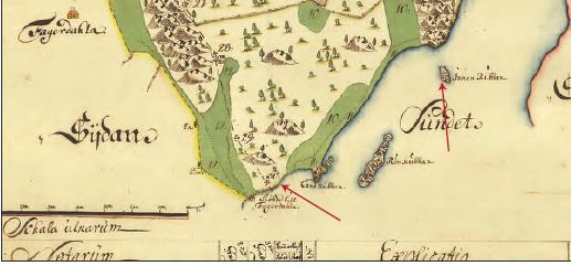 Kartan (nedan) från 1709 över Fagerdala/Älvsala visar stenkistan/bryggan som är daterad till omkring år 1600 vid en ö, “Innan Kubban”, (högra pilen på kartan) som numera, på grund av landhöjningen, är förbunden med fastland, vilket framgår av kartan från 2011 (se ovan)
