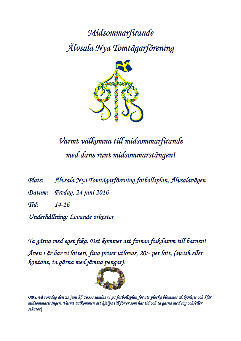 Det blir traditionsenligt midsommarfirande på fotbollsplanen den 24 juni klockan 14.00. Underhållning med levande orkester. Ta gärna med eget fika. Fiskdamm finns till barnen. Lotter säljes. Kom gärna och hjälp till att klä midsommarstången kvällen före från klockan 18.00. Se inbjudan från midsommargruppen här i inlägget.